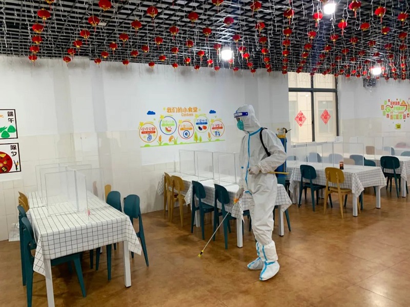 車間、電梯、衛(wèi)生間、大堂、食堂等區(qū)域嚴(yán)格消毒,不放過(guò)每個(gè)角落,不放過(guò)每個(gè)細(xì)節(jié)。食堂還專門放置了透明隔板,保障用餐安全。